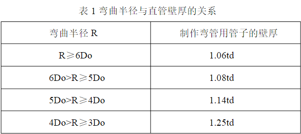 弯管制作 1、弯管宜采用壁厚为正公差的管子制作。弯曲半径与直管壁厚的关系宜符合表1的规定。