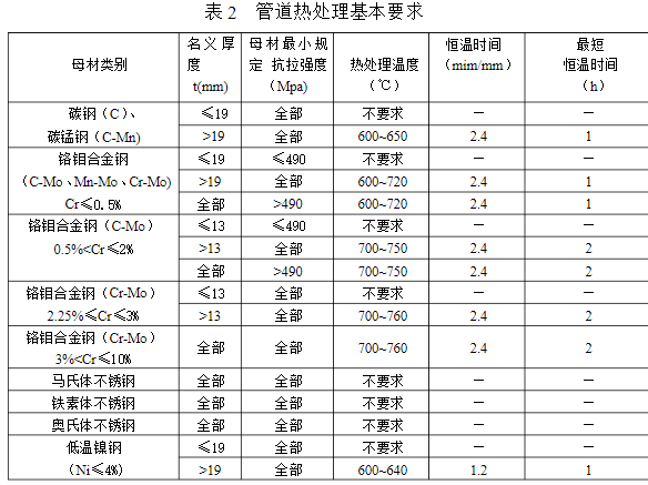 表2 管道热处理基本要求