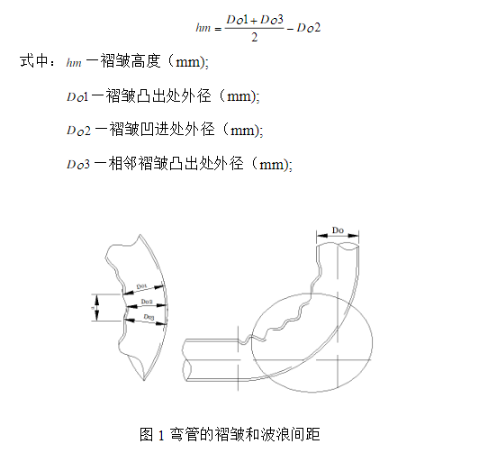 8、管子弯制后,应将内外表面清理干净。弯管质量应符合下列规定: 1 不得有裂纹、过烧、分层等缺陷。 2 弯管内侧褶皱高度不应大于管子外径的3%,波浪间距(图3)不应小于褶皱高度的12倍。褶皱高度应按下式计算: